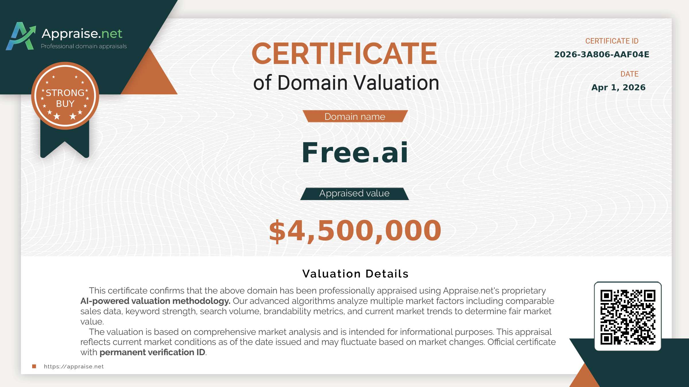 This is a trophy-level domain. The valuation reflects its status as a top 0.01% asset in the .ai namespace, with a direct parallel to the value of elite single-word .com domains.
